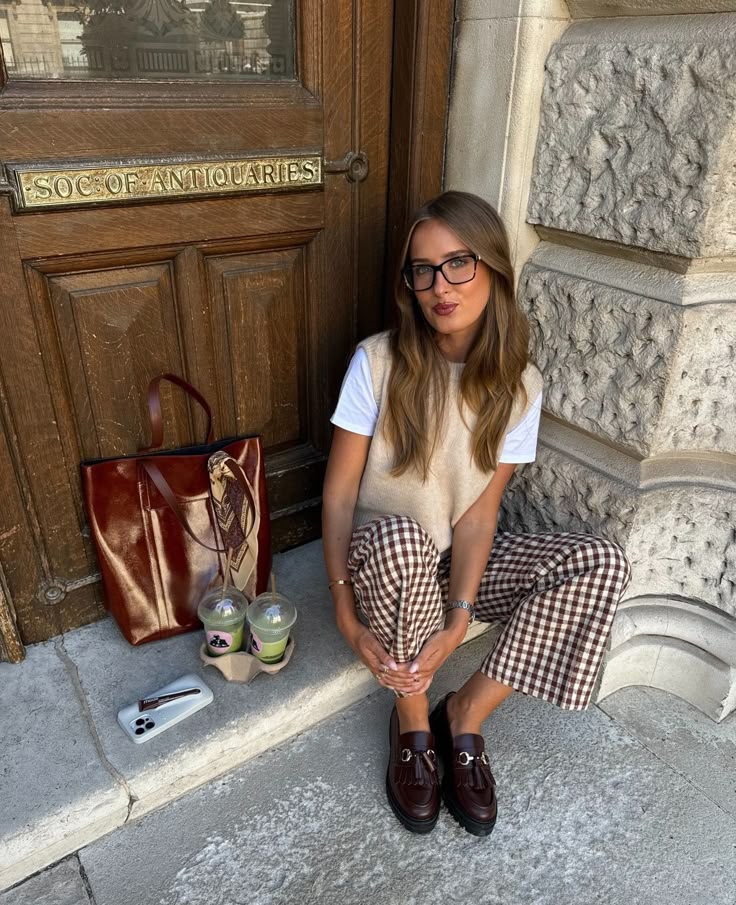 Finishing the look, deep brown loafers echo the warm hues of the leather handbag and sunglasses, tying everything together. It’s a grounded yet elevated way to wear neutrals that still feels full of personality.