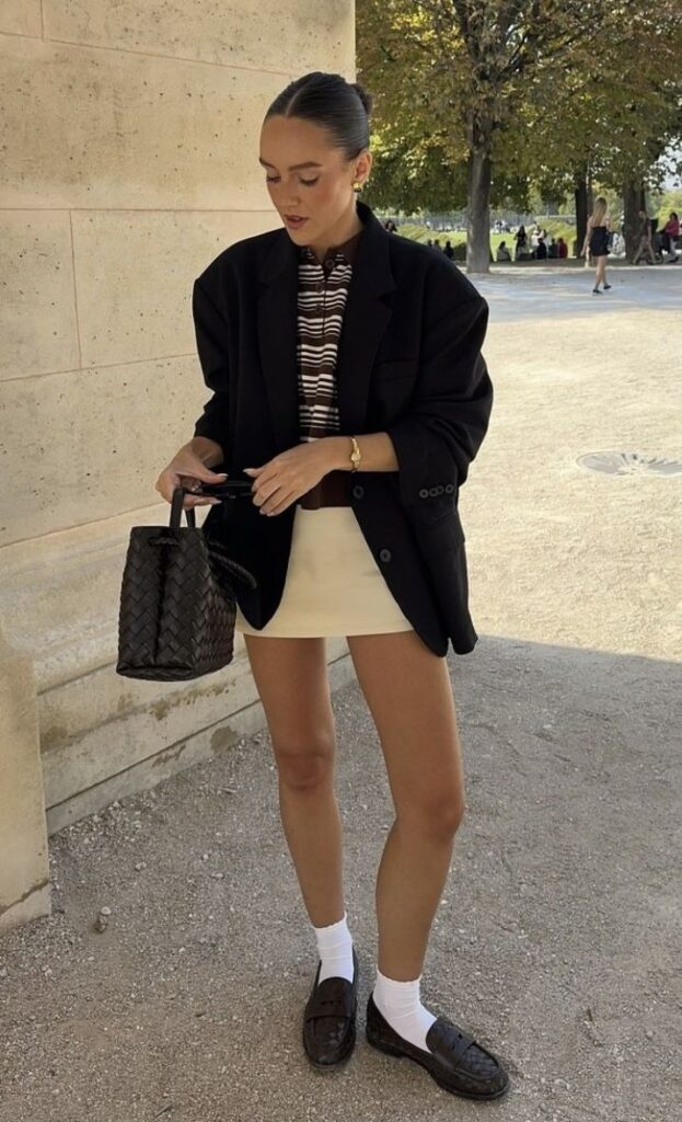 This outfit proves that structured and playful can coexist beautifully. An oversized black blazer creates a bold frame over a striped polo and cream mini skirt, delivering crisp contrast in both silhouette and tone.