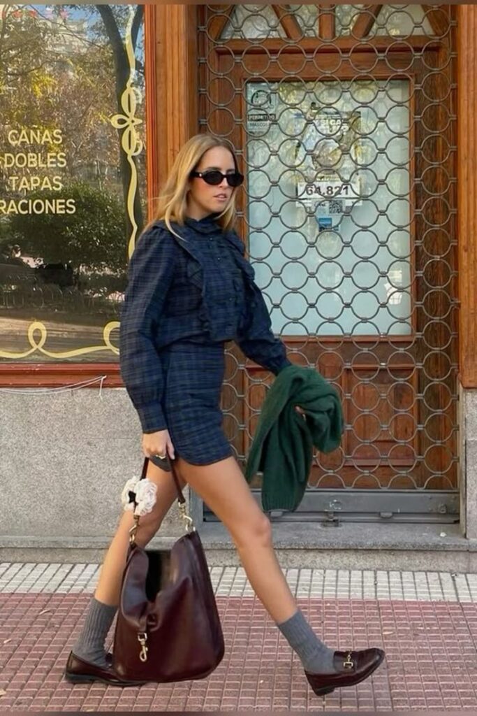 A matching navy plaid blouse and mini skirt create a cohesive, tailored silhouette that feels polished yet playful. The ruffled front detail adds a romantic edge to the preppy look, giving it unexpected softness. Gray crew socks paired with rich burgundy loafers offer a grounded contrast that’s both practical and fashion-forward.