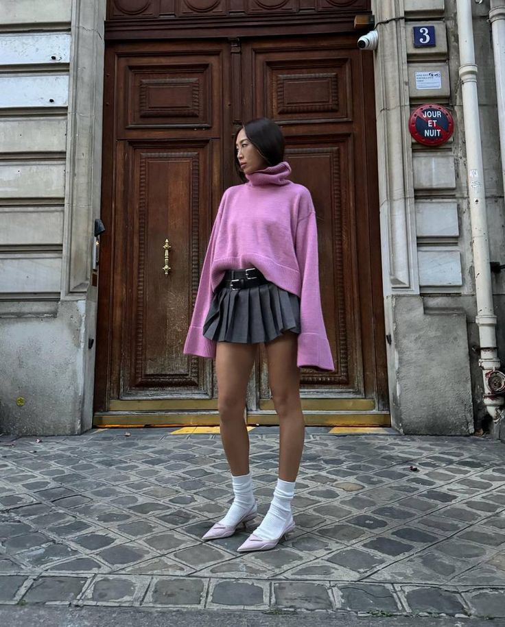This look is proof that kitten heels and socks can be playful, pretty, and totally runway-worthy. Pale pink heels and crisp white socks bring a flirty contrast to the pleated charcoal mini skirt, while the oversized bubblegum pink turtleneck adds volume and softness up top.