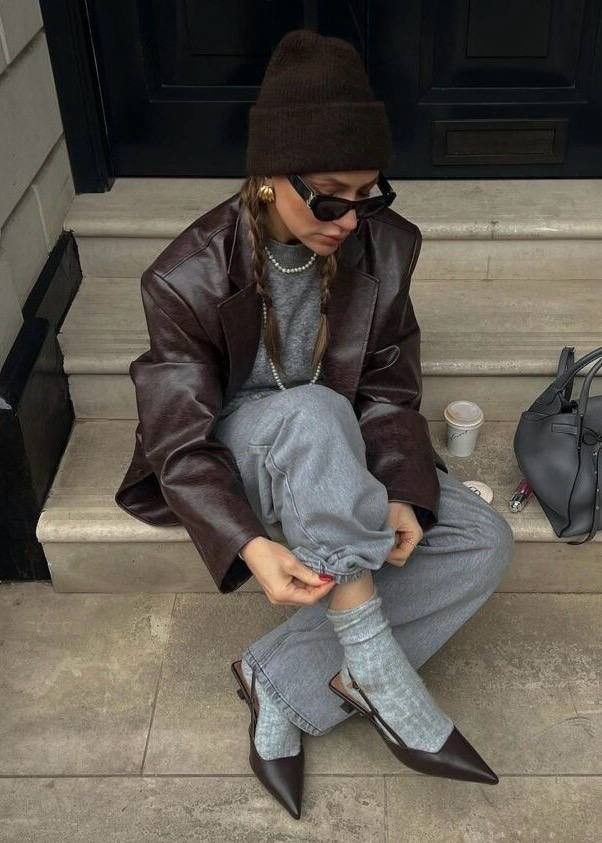 This look makes a strong case for throwing the rulebook out the window—and looking incredible while doing it. The combo of grey slouch socks and chocolate kitten-heel slingbacks is delightfully unexpected, balancing cozy loungewear with sharp, sculptural footwear.