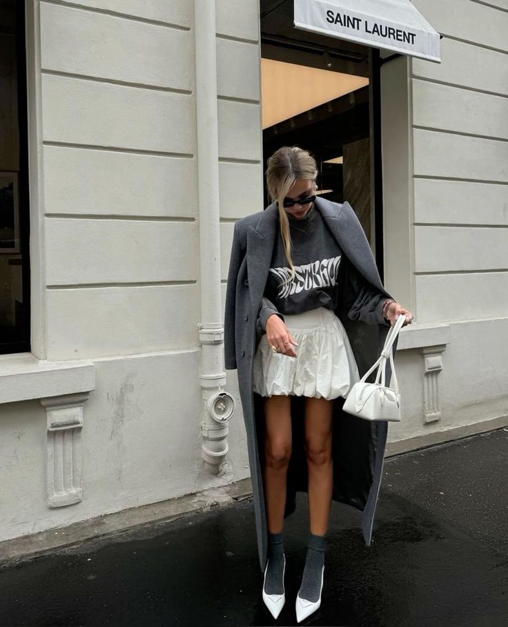 Paired with a puffed ivory mini skirt, graphic sweatshirt, and a tailored floor-length coat, the vibe is effortlessly cool with just the right amount of drama. The mini white handbag ties it all together for a monochrome moment with edge. It’s sporty, luxe, and street-style ready—all thanks to socks that refuse to play it safe.