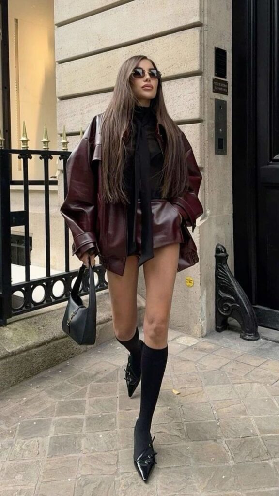 This look is all about power styling with precision. The glossy black kitten heels with buckle detailing are razor-sharp, but it’s the tall black socks that take them into It-Girl territory. Worn with a matching leather mini skirt and oversized oxblood jacket, this outfit feels fearless, elevated, and totally curated.