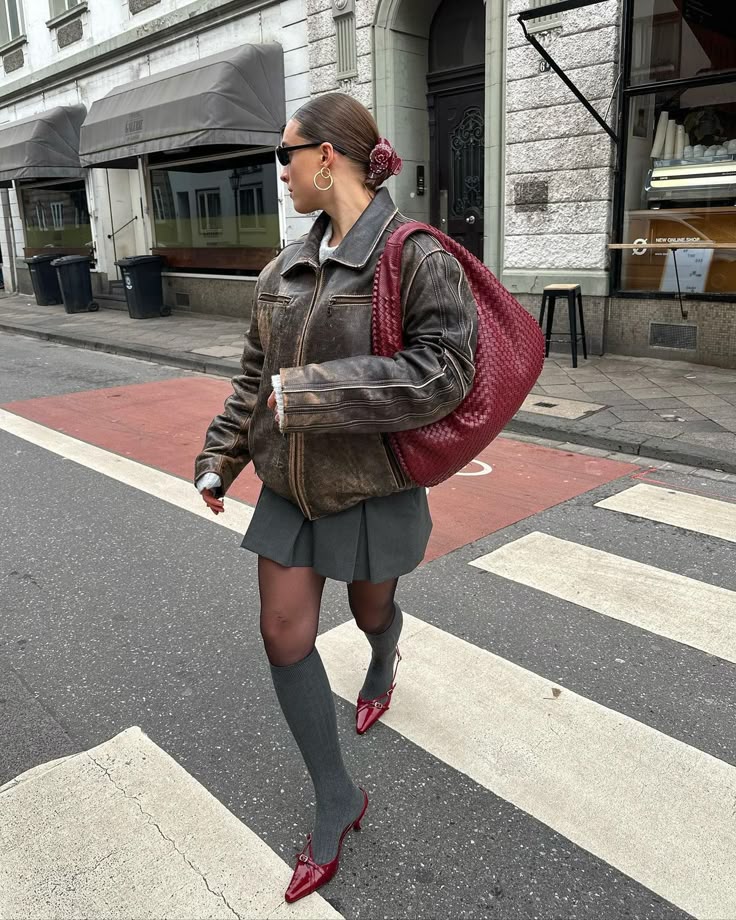 This look is proof that kitten heels and socks aren’t just a trend—they’re a styling strategy. The sleek, pointed-toe patent kitten heels in a bold oxblood red add a luxe edge, while the ribbed knee-high socks keep things grounded and cool. Paired with a pleated mini skirt and oversized distressed leather jacket, the outfit strikes that perfect “old money meets downtown” balance.