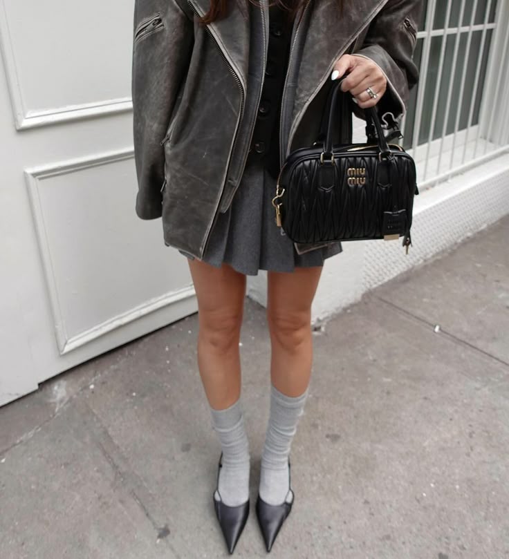 A pleated mini and oversized distressed moto jacket add depth and dimension, while a structured black Miu Miu bag pulls it all together with polish. The socks keep it playful, while the shoe silhouette keeps it sharp. It’s giving “cool girl who knows fashion rules—and knows when to break them.”